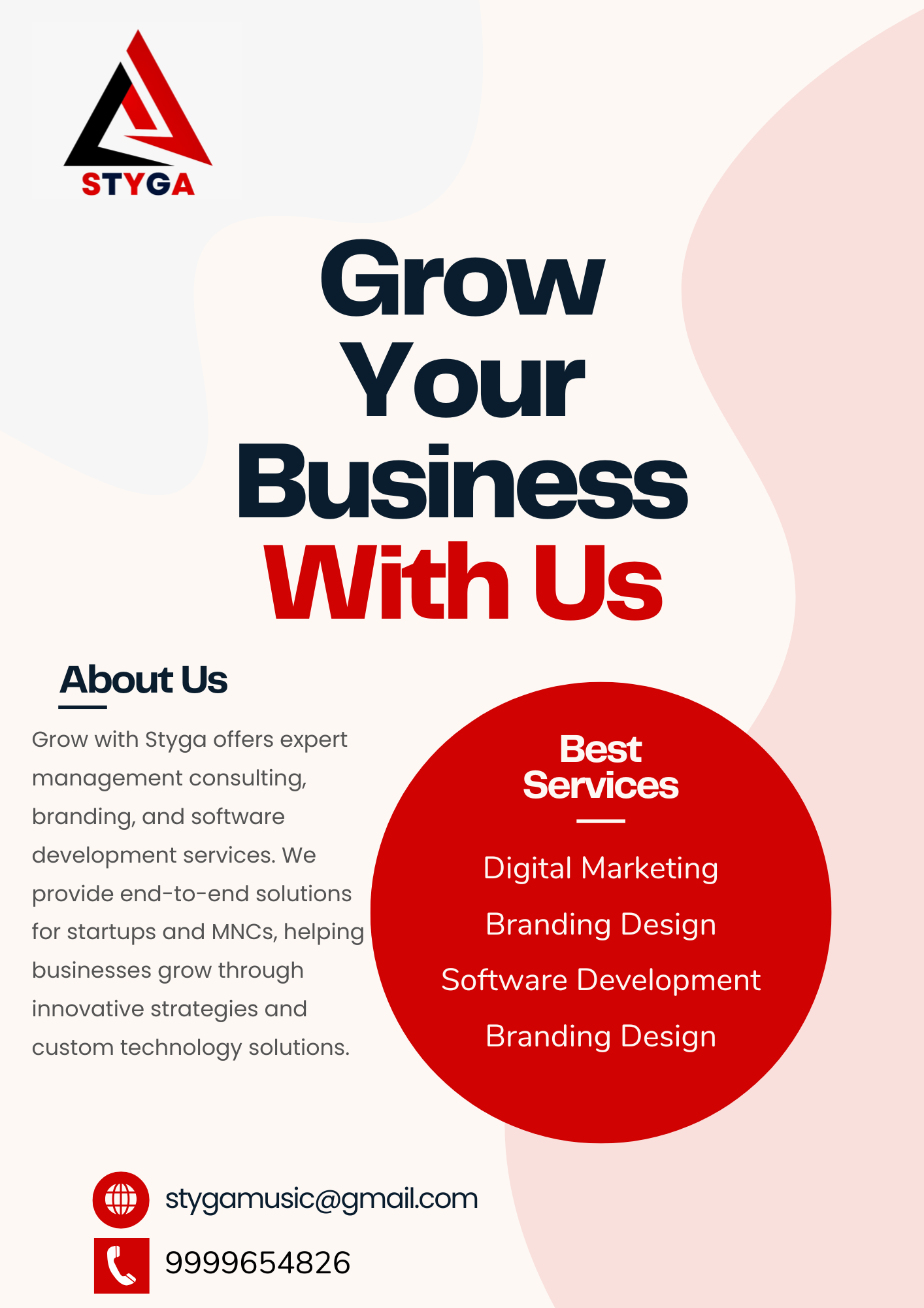 Grow with Styga is a leading provider of comprehensive solutions for startups and MNCs. Specializing in management consulting, branding, and software development, we help businesses accelerate their growth through innovative strategies and cutting-edge technology. With a focus on delivering end-to-end solutions, we empower companies to thrive in competitive markets. Whether you're looking to scale your operations, enhance your brand identity, or build custom software, Grow with Styga is your trusted partner for success. Based on years of industry expertise, we cater to businesses of all sizes, ensuring measurable results and long-term growth. Contact us today to take your business to the next level with our tailored services in business consulting, digital transformation, and custom software development.